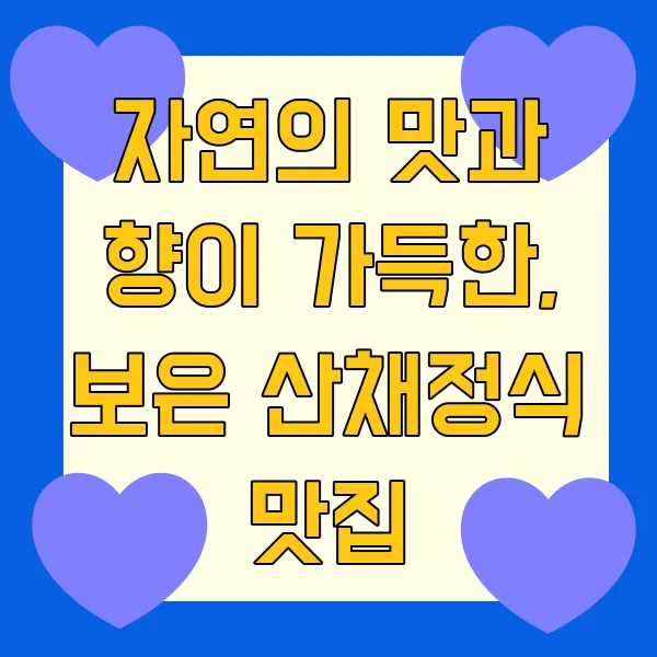 100여 가지 산야초 로 만든 건강 밥상을 만날 수 있는 배영숙산야초밥상은 보은 특산 대추로 지은 밥과 산야초 발효액을 사용한 다양한 반찬을 제공합니다. 자연 그대로의 맛과 향을 느끼며 건강까지 챙길 수 있는 곳입니다. 산야초 효소를 활용한 건강 음료와 디저트도 준비되어 있어 몸과 마음을 힐링하기에 제격입니다.