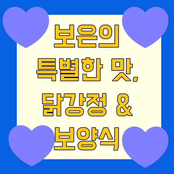 | 8 | 복해가든 | 능이백숙, 닭볶음탕 | 충북 보은군 장안면 개안길 15-9 | 30년 전통 보양식 전문 |